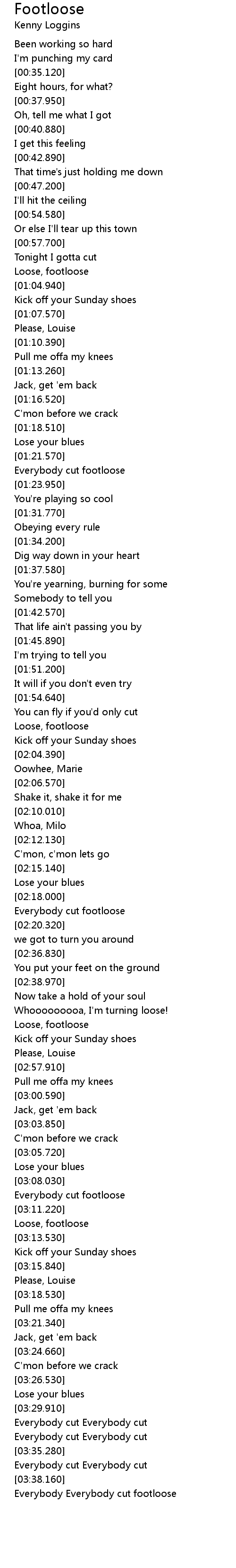 Blake Shelton - Footloose Lyrics Pitch is shifted to avoid copyright Thanks for watching :). Footloose Lyrics are a theme that is being searched for and appreciated by netizens these days. You can Download the Footloose Lyrics here. Save all royalty-free pix. Kenny Loggins- Footloose (lyrics), Lyrics "Footloose" by Kenny Loggins Been working so hard I'm punching my card Eight hours for what Oh, tell me what I got I've .